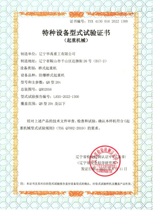 防爆双梁型式试验合格证